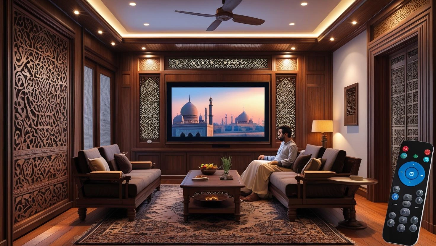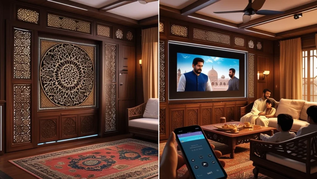 - Example: Lahore residence hides 75″ screen behind Persian miniature