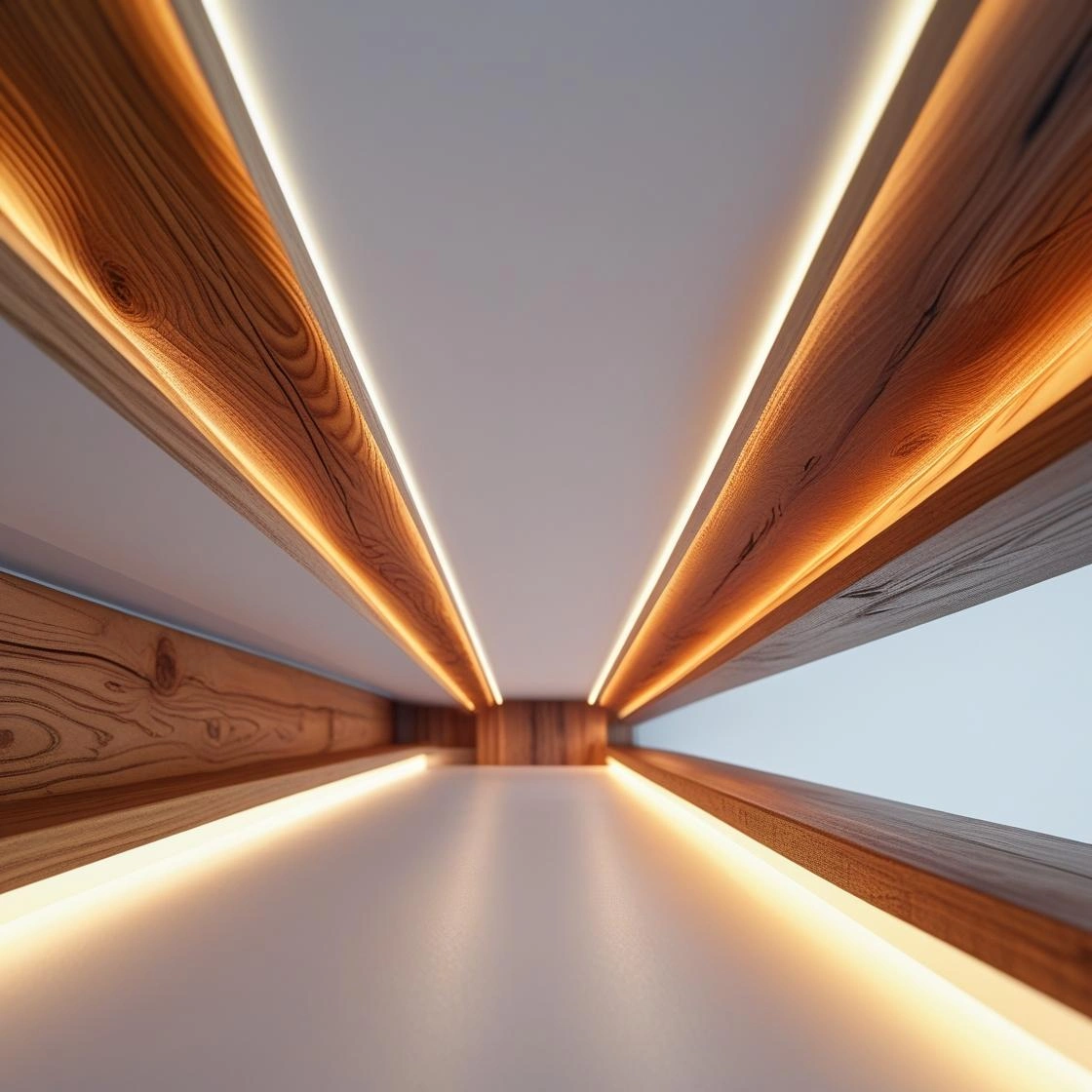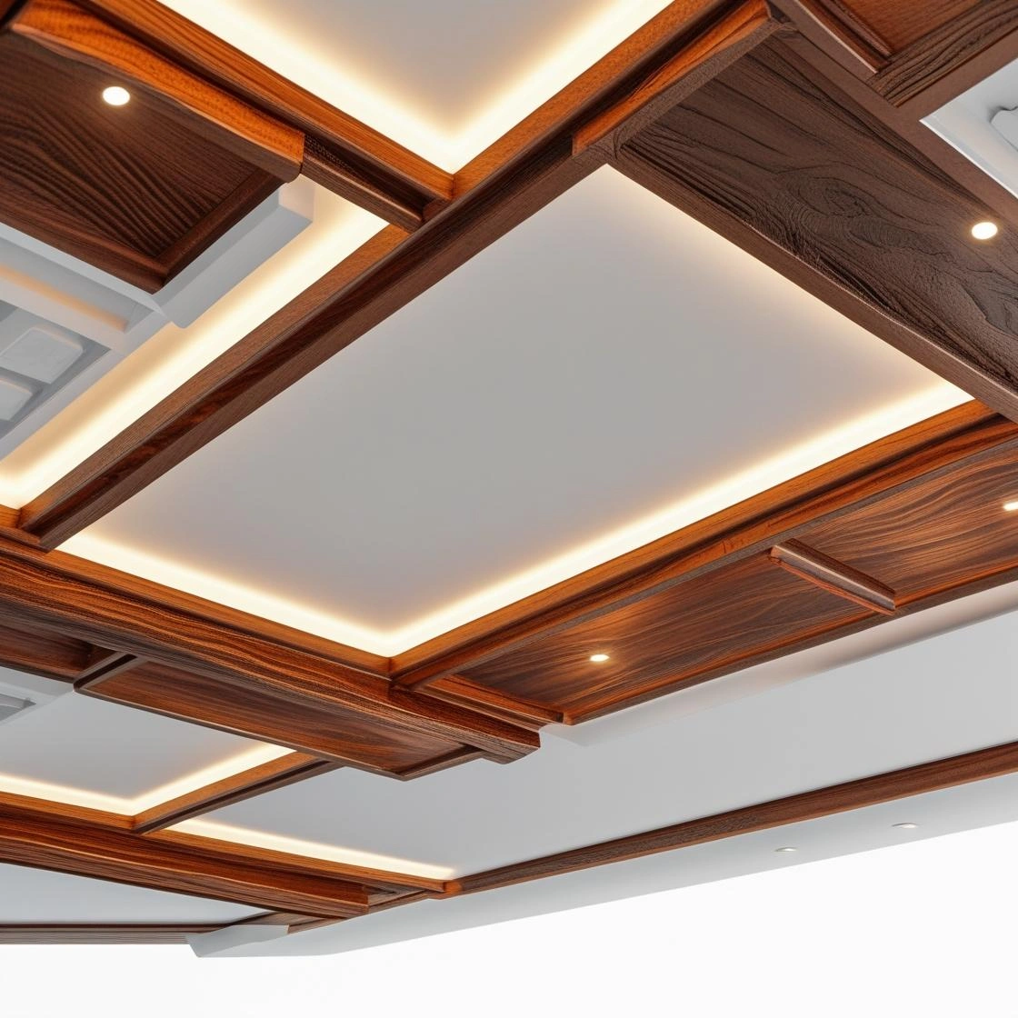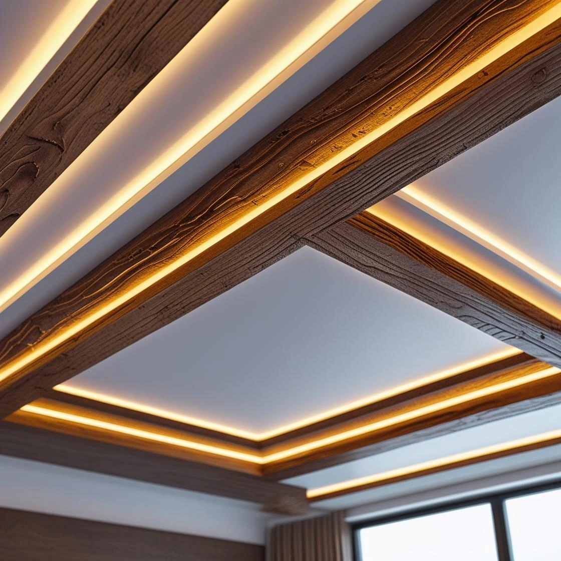> *Introducing our Cove Lighting False Ceiling with Wooden Beam Accents* – a transformative design solution merging ambient lighting with organic elegance. This system features: