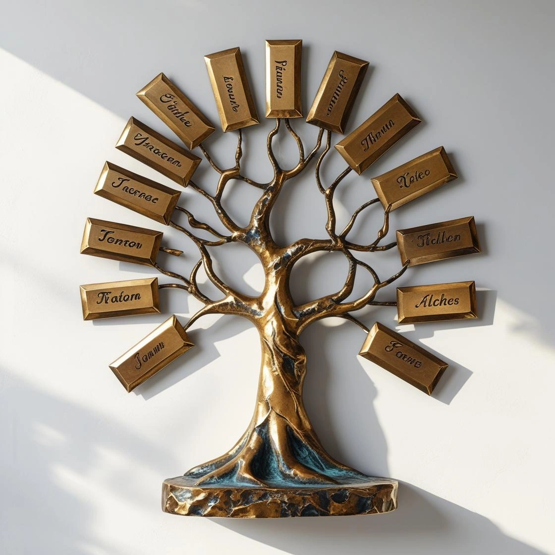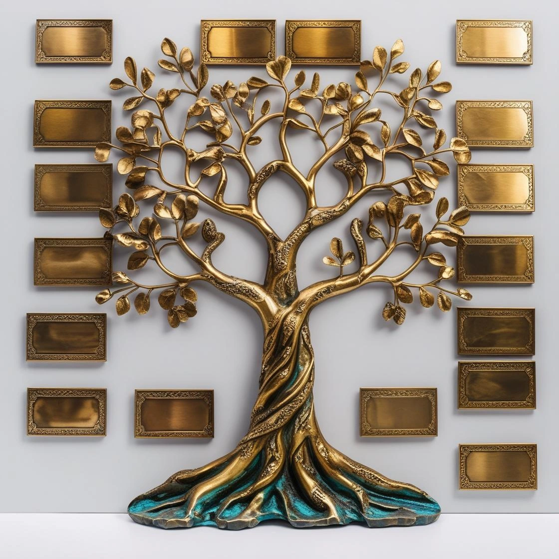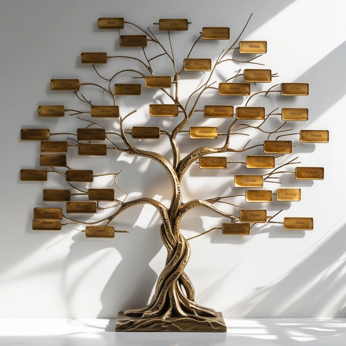 > *Introducing our Customizable Metal Tree of Life Wall Sculpture* – a profound symbol of heritage and growth for Pakistani households. Expertly crafted by Lahore’s metal artisans, this intricate sculpture features a laser-cut tree design with branching patterns that hold up to 12 personalized name plates. Choose from brass, copper, or black steel finishes with optional Arabic calligraphy or family names.
