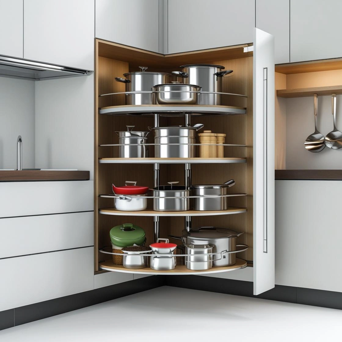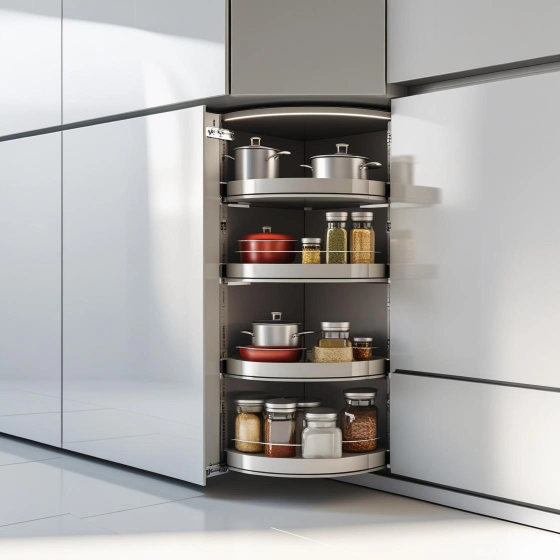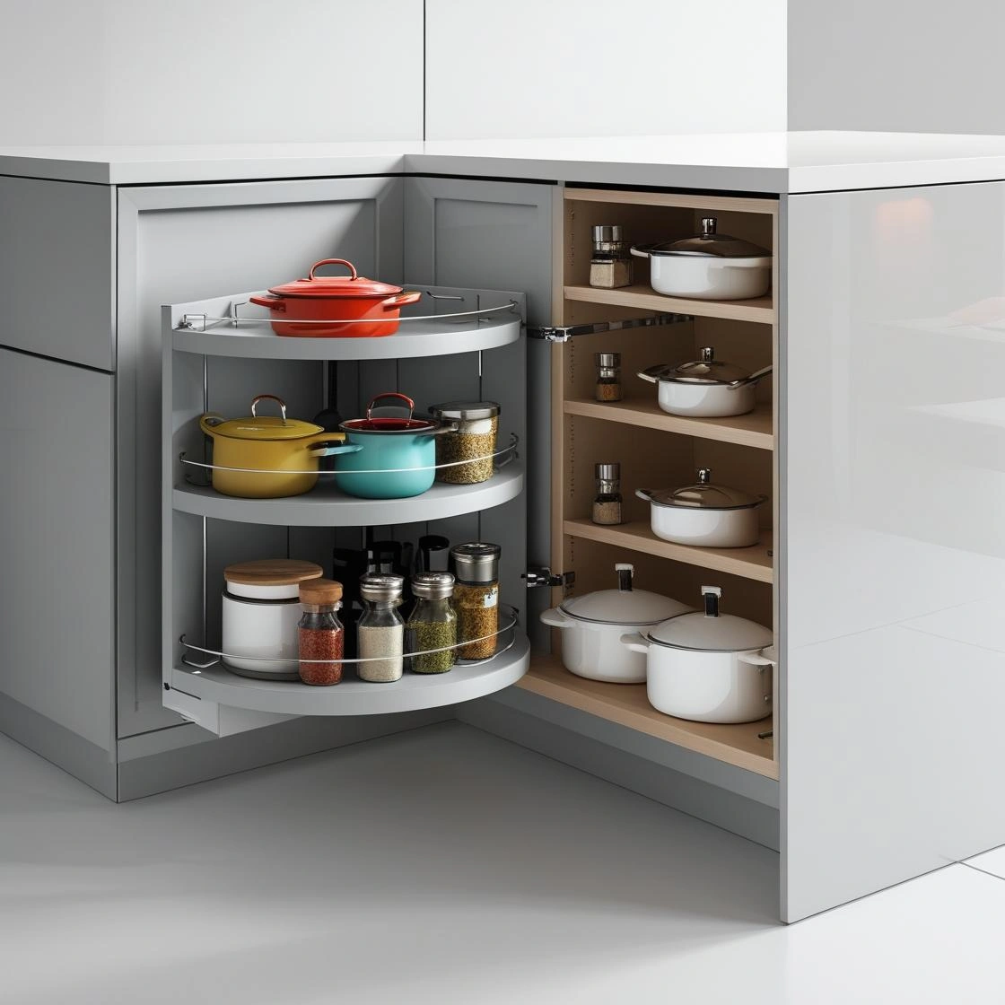> *Introducing our Space-Design Corner Pull-Out Cabinet System* – the ultimate solution for “dead corners” in Pakistani modular kitchens. This innovative rotating shelf system features aircraft-grade aluminum mechanisms with 360° smooth rotation, allowing full access to deep corner cabinets. Engineered specifically for Pakistani cooking needs with adjustable stainless steel shelves and integrated spice organizers.