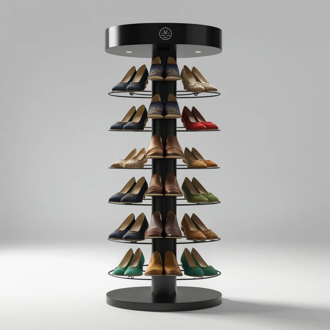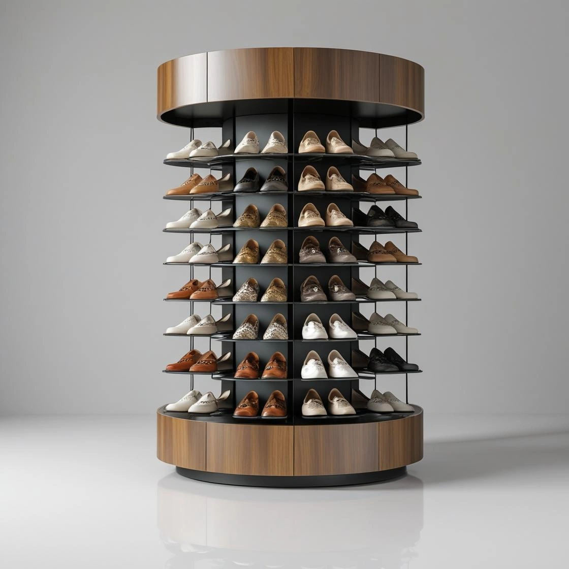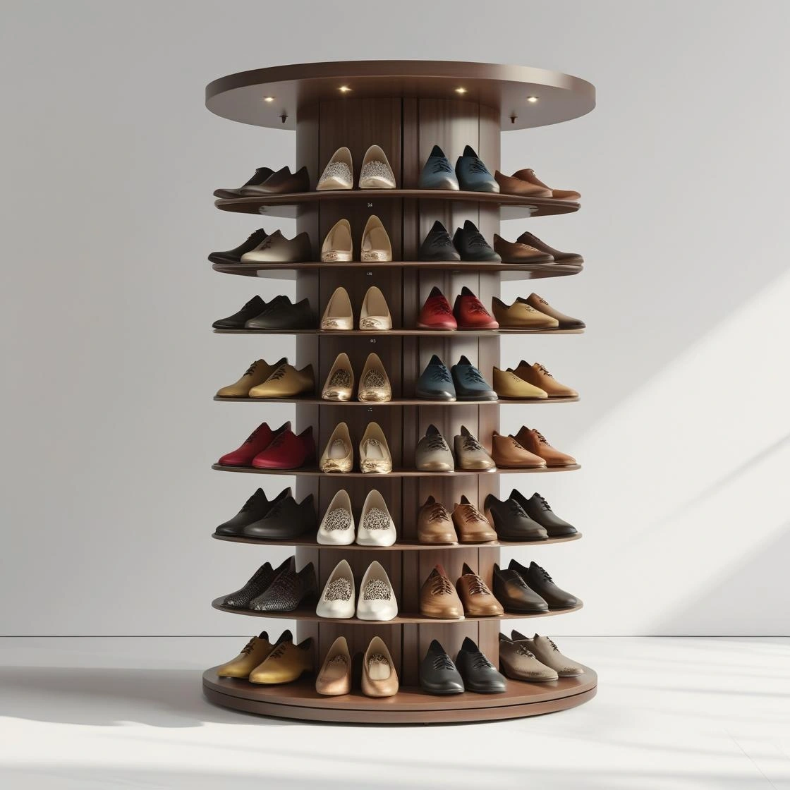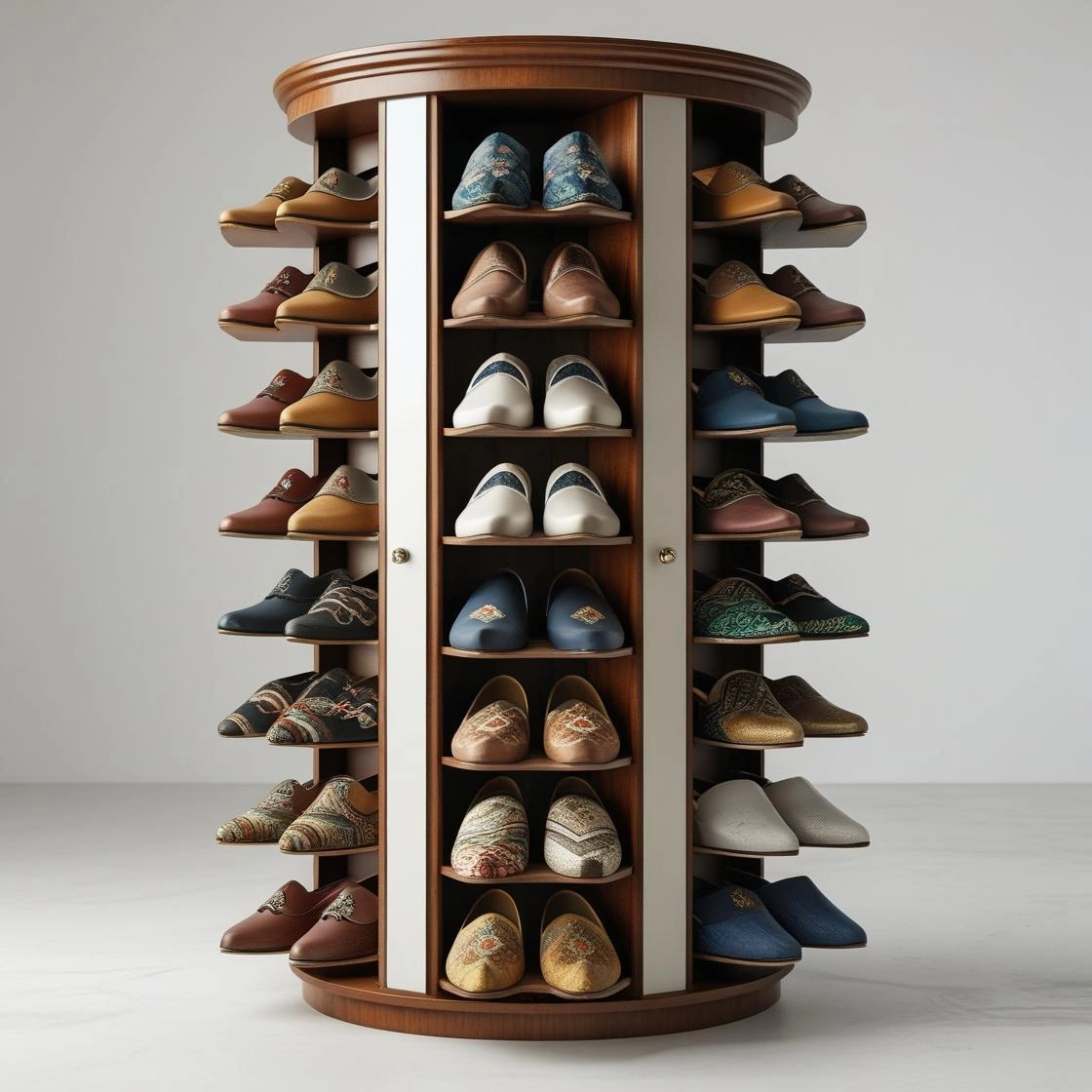 > *Introducing our Vertical Shoe Carousel Cabinet with 40-Pair Capacity* – the ultimate footwear storage solution for Pakistani homes. This innovative cabinet features a patented rotating carousel mechanism that provides 360° access to your shoe collection while occupying minimal floor space. Designed specifically for Pakistani footwear types with adjustable shelves that accommodate everything from chappals to formal heels.